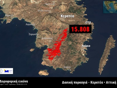 Δορυφορικά δεδομένα πολύ υψηλής ανάλυσης από τον δορυφόρο Legion (αισθητήρας VHR2) που πέρασε πάνω από την περιοχή το μεσημέρι του Σαββάτου 9 Αυγούστου 2025 και επεξεργάστηκε η ομάδα του meteo.gr / Εθνικού Αστεροσκοπείου Αθηνών, αποκαλύπτουν την έκταση της περιοχής που επλήγη από τη μεγάλη δασική πυρκαγιά στην Κερατέα Αττικής.