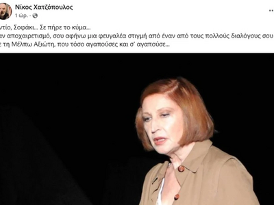 «Αντίο, Σοφάκι… Σε πήρε το κύμα…Σαν αποχαιρετισμό, σου αφήνω μια φευγαλέα στιγμή από έναν από τους πολλούς διαλόγους σου με τη Μέλπω Αξιώτη, που τόσο αγαπούσες και σ' αγαπούσε...»