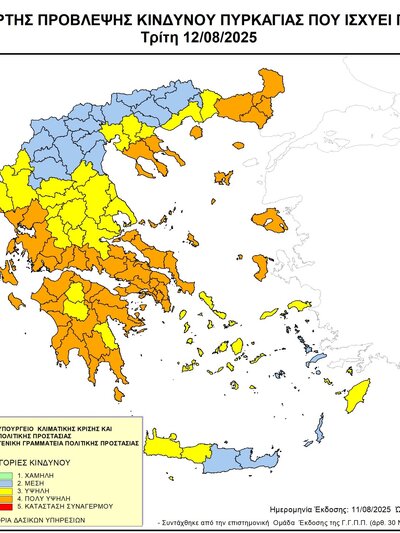 Πολύ υψηλός κίνδυνος πυρκαγιάς (κατηγορία 4) προβλέπεται και για αύριο, Τρίτη 12 Αυγούστου 2025, σε μεγάλο μέρος της κεντρικής και νότιας ηπειρωτικής χώρας και το βορειοανατολικό Αιγαίο, σύμφωνα με τον Χάρτη Πρόβλεψης Κινδύνου Πυρκαγιάς που εκδίδει η Γενική Γραμματεία Πολιτικής Προστασίας (ΓΓΠΠ).