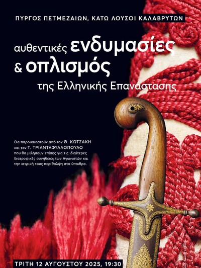 Την Τρίτη 12-8, στις 7.30 μ.μ., στον Πύργο Πετμεζαίων στους Κάτω Λουσούς έχει προγραμματιστεί παρουσίαση αυθεντικών ενδυμασιών και οπλισμού της Ελληνικής Επανάστασης και ομιλία για τις ιδιαίτερες διατροφικές συνήθειες των Αγωνιστών και την ιατρική τους περίθαλψη κατά τη διαβίωσή τους στην ύπαιθρο.
