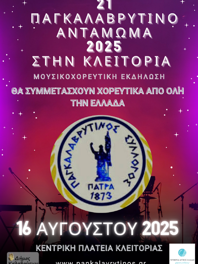 Ο Παγκαλαβρυτινός Σύλλογος Πατρών, ο Δήμος Καλαβρύτων και η Περιφέρεια Δυτικής Ελλάδας ενώνουν τις δυνάμεις τους και συνδιοργανώνουν το 21ο Παγκαλαβρυτινό Αντάμωμα, το οποίο φέτος φιλοξενείται στην πανέμορφη Κλειτορία Καλαβρύτων, το Σάββατο 16 Αυγούστου 2025, στις 20:30.