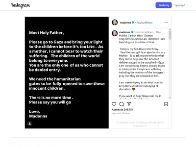 Η Madonna λοιπόν βρέθηκε ξανά στην πρώτη γραμμή της επικαιρότητας καθώς απηύθυνε έκκληση στον Πάπα Λέοντα να επισκεφθεί τη μαρτυρική Γάζα, προκειμένου να βοηθήσει τα παιδιά που βιώνουν τον εφιάλτη του πολέμου, της εξαθλίωσης και της πείνας.