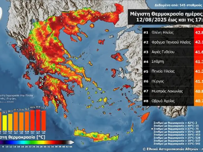 Σε Πελοπόννησο, Δυτική Στερεά και Ήπειρο καταγράφηκαν οι υψηλότερες θερμοκρασίες της Τρίτης 12/08, σύμφωνα με το δίκτυο αυτόματων μετεωρολογικών σταθμών του Εθνικού Αστεροσκοπείου Αθηνών / meteo.gr.