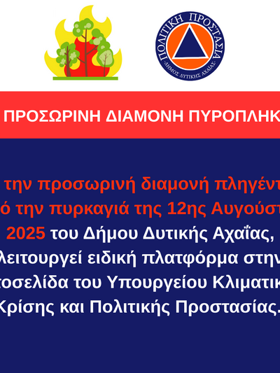 Ειδική πλατφόρμα λειτουργεί στην ιστοσελίδα του Υπουργείου Κλιματικής Κρίσης και Πολιτικής Προστασίας για την προσωρινή διαμονή πληγέντων, από την πυρκαγιά της 12ης Αυγούστου 2025 στις πληγείσες περιοχές του Δήμου Δυτικής Αχαΐας.