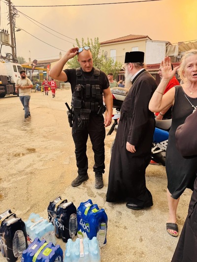 Μέ ἐντολή τοῦ σεβασμιοτάτου Μητροπολίτη Πατρών καί μέ τήν ἐπιστασία τοῦ ἰδίου, ἐδόθησαν στούς Πυροσβέστες καί στούς Ἀστυνομικούς ἐμφιαλωμένα νερά.