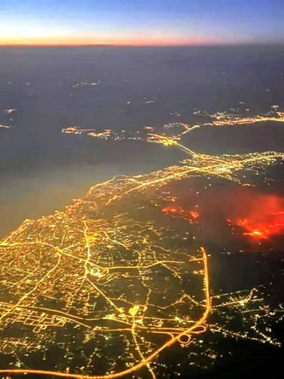 Στην εικόνα, η φωτισμένη πόλη απλώνεται στον ορίζοντα, ενώ σε μικρή απόσταση διακρίνονται τα πύρινα μέτωπα να καίνε ανεξέλεγκτα.