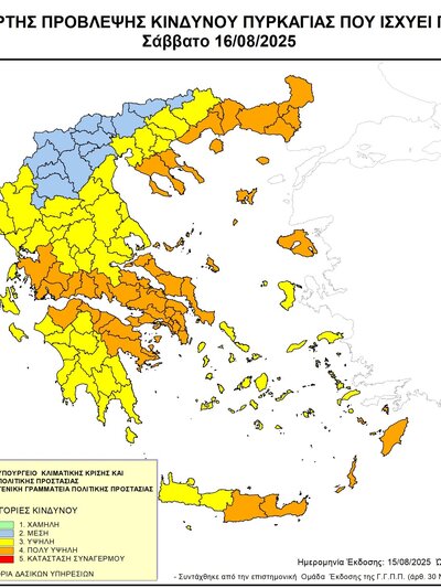 Πολύ υψηλό κινδύνου πυρκαγιάς (κατηγορία 4) προβλέπει η Γενική Γραμματεία Πολιτικής Προστασίας σε περιοχές της Περιφέρειας Δυτικής Ελλάδα και ιδιαίτερα στις ΠΕ Αχαΐας και Αιτωλοακαρνανίας όπως φαίνεται στον επισυναπτόμενο ημερήσιο Χάρτη Πρόβλεψης Κινδύνου Πυρκαγιάς για το Σάββατο 16/08/2025. Από την Πολιτική Προστασία εφισταται η προσοχή στους πολίτες να είναι προσεκτικοί και να αποφεύγουν ενέργειες που μπορούν να