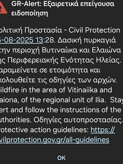 «Δασική πυρκαγιά στην περιοχή Βυτιναίικα και Ελαιώνα της Περιφερειακής Ενότητας Ηλείας. Παραμείνετε σε ετοιμότητα και ακολουθείτε τις οδηγίες των αρχών», αναφέρει το προειδοποιητικό μήνυμα, παραπέμποντας και στις οδηγίες αυτοπροστασίας μέσω του civilprotection.gov.gr.