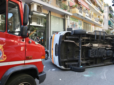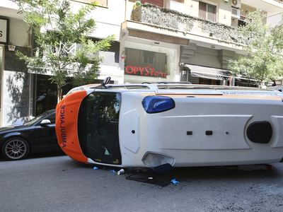 Μετά την ανατροπή του, το ασθενοφόρο έπεσε και τουλάχιστον σε ένα σταθμευμένο όχημα στο οποίο προκλήθηκαν υλικές ζημιές.