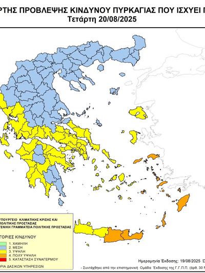 Σύμφωνα με το χάρτη πρόβλεψης που εκδίδει η Γενική Γραμματεία Πολιτικής Προστασίας του Υπουργείου Κλιματικής Κρίσης & Πολιτικής Προστασίας, για την Τετάρτη θα υπάρχει κίνδυνος στις περιφέρειες του βορείου και νοτίου Αιγαίου αλλά και στην Κρήτη.