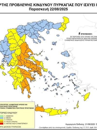 Σύμφωνα με το Χάρτη Πρόβλεψης Κινδύνου Πυρκαγιάς που εκδίδει η Γενική Γραμματεία Πολιτικής Προστασίας του Υπουργείου Κλιματικής Κρίσης & Πολιτικής Προστασίας (civilprotection.gov.gr), για αύριο Παρασκευή 22 Αυγούστου 2025, προβλέπεται πολύ υψηλός κίνδυνος πυρκαγιάς (κατηγορία κινδύνου 4) για τις εξής περιοχές: