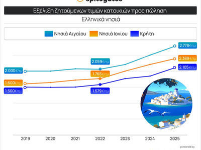 Ειδικότερα, την τελευταία εξαετία, στα νησιά του Ιονίου, η μέση ζητούμενη τιμή (ΜΖΤ) πώλησης κατοικιών αυξήθηκε κατά 49,3% για την περίοδο 2019-2025, φτάνοντας σήμερα (2ο τρίμηνο 2025) τις 2.389 ευρώ /τ.μ. Στην Κρήτη, η άνοδος είναι επίσης θεαματική, με τη ΜΖΤ να διαμορφώνεται στις 2.105 ευρώ/τ.μ., καταγράφοντας αύξηση 40,4% σε σχέση με το 2019. Τα νησιά του Αιγαίου συνεχίζουν να σημειώνουν τις μεγαλύτερες τιμές, με τη ΜΖΤ πώλησης κατοικίας το 2025 να φτάνει τις 2.778 ευρώ/τ.μ., αυξημένη κατά 38,9% από το δεύτερο τρίμηνο του 2019.