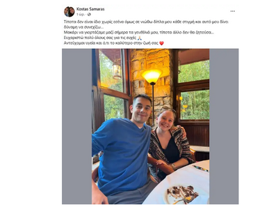 Στο συγκινητικό μήνυμά του στο Facebook την Παρασκευή (22.08) για την πρόωρα χαμένη αδερφή του, Λένα Σαμαρά, ο γιος του Αντώνη Σαμαρά, Κώστας αναφέρει: «Τίποτα δεν είναι ίδιο χωρίς εσένα όμως σε νιώθω δίπλα μου κάθε στιγμή και αυτό μου δίνει δύναμη να συνεχίζω… Μακάρι να γιορτάζαμε μαζί σήμερα τα γενέθλιά μου, τίποτα άλλο δεν θα ζητούσα… Ευχαριστώ πολύ όλους σας για τις ευχές. Αντεύχομαι υγεία και ό,τι το καλύτερο στην ζωή σας».