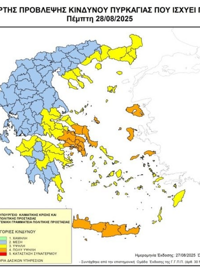 Πολύ υψηλός ο κίνδυνος εκδήλωσης πυρκαγιάς προβλέπεται για σήμερα Πέμπτη (κατηγορία κινδύνου 4) σε περιοχές της Αττικής καθώς και σε τρεις ακόμη Περιφέρειες, σύμφωνα με τον Χάρτη Πρόβλεψης Κινδύνου Πυρκαγιάς που εξέδωσε η Γενική Γραμματεία Πολιτικής Προστασίας.