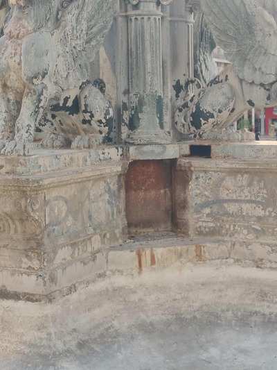 «Σήμερα το πρωί διαπίστωσα με λύπη μου περνώντας από την Πλατεία Γεωργίου πως ένα τμήμα της μετόπης της σταυροειδούς βάσης του πάνω σιντριβανιού της Πλατείας Γεωργίου έχει καταρρεύσει. Είναι εκτεθειμένο και μπορεί να το πάρει κάποιος άνετα και να το πάει για λιώσιμο. Πήρα τηλέφωνο τον δήμο και ανέφερα την κρισιμότητα της κατάστασης. Τρεις ώρες μετά πέρασα ξανά και το τμήμα εξακολουθούσε να είναι εκεί. Είναι άκρως επείγον να επιληφθεί κάποιος γιατί, αν αφαιρεθεί αυτό το τμήμα, μιλάμε για δομική καταστροφή του μνημείου. Σταμάτησα επιπλέον έναν εργαζόμενο του Δήμου Πατρέων που τον βρήκα με ένα αγροτικό και του είπα τα παραπάνω. Δυστυχώς δεν έχει γίνει τίποτα ακόμα!»