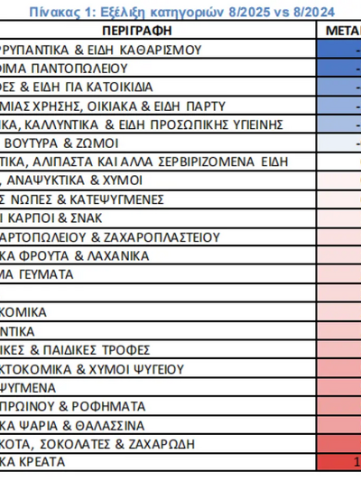 Μεγαλύτερες μειώσεις τιμών τον Αύγουστο 2025 σε σχέση με τον Αύγουστο 2024 καταγράφονται στις κατηγορίες:
