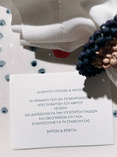 Τα χρήματα που θα συγκεντρωθούν από τη βάπτιση του μικρού Λέοντα θα διατεθούν για την υποστήριξη παιδιών και οικογενειών στη Γάζα.