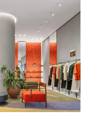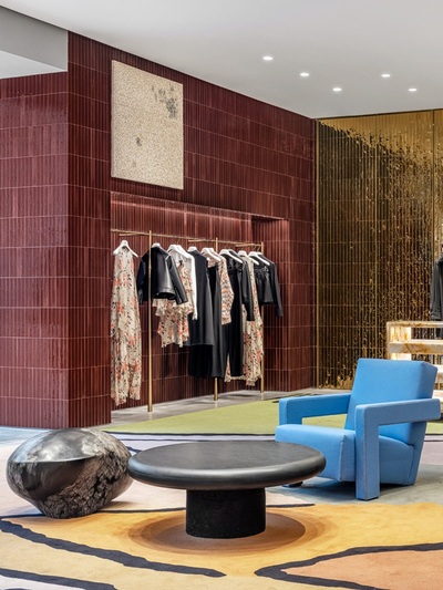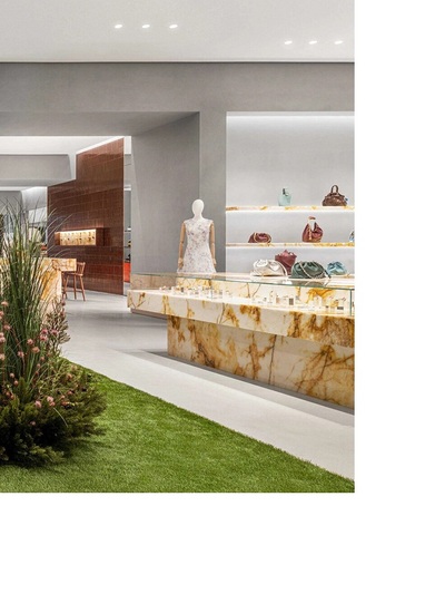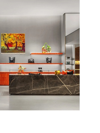 Στο εσωτερικό της, η μοναδική αυτή μπουτίκ διαθέτει έργα σύγχρονης τέχνης, άφθονο λευκό neon φωτισμό, «πλάτες» από χρυσό και επίπλωση από μάρμαρο με «νερά». Οι πινελιές σε κεραμιδί, πορτοκαλί και τιρκουάζ αποτελούν αναφορά στα αιρετικά στοιχεία της διαδρομής της εταιρείας.