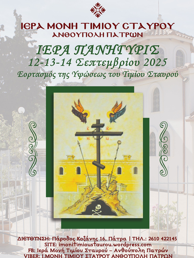 Περισσότερα στο imonitimioustaurou.wordpress.com καθώς και στη σελίδα της Μονής στο Facebook: Ιερά Μονή Τιμίου Σταυρού – Ανθούπολη Πατρών.