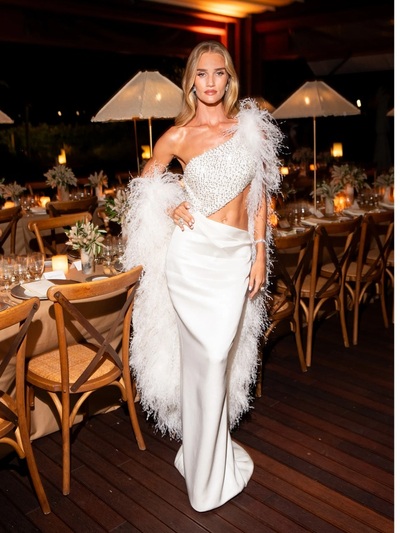 Φόρεσε μια εκρού couture δημιουργία Armani Privé με ανοίγματα, κεντήματα και φτερά, φτιαγμένη ειδικά για εκείνη. Ηταν μια τουαλέτα που επαναπροσδιόρισε το λεγόμενο old Hollywood glam. Σε συνδυασμό με διαμαντένια κοσμήματα Tiffany και απαλές «σκάλες» στα μαλλιά, η Ρόζι ήταν πανέμορφη.