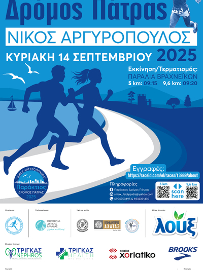 Με μεγάλο ενδιαφέρον συνεχίζονται οι εγγραφές για τον «Παράκτιος Δρόμος Πάτρας 2025 Νίκος Αργυρόπουλος» που θα διεξαχθεί την Κυριακή 14 Σεπτεμβρίου στην Πάτρα, με διοργανωτή το Σύλλογο Μαραθωνοδρόμων Αχαΐας (Σ.Μ.ΑΧ.) «Φειδιππίδης», και περιλαμβάνει αγώνες δρόμου 9.6χλμ και 5χλμ.