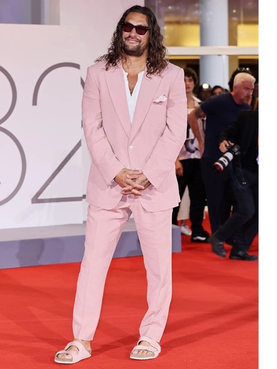 Τέλος, ο σωματώδης Τζέισον Μομόα φόρεσε κοστούμι, με τριχωτά Birkenstock και βαμμένα νύχια όλα στη μονοχρωμία του ροζ. Πρόκειται άλλωστε για την αγαπημένη του απόχρωση που έχει υιοθετήσει κατά καιρούς σε διάφορες παραλλαγές.