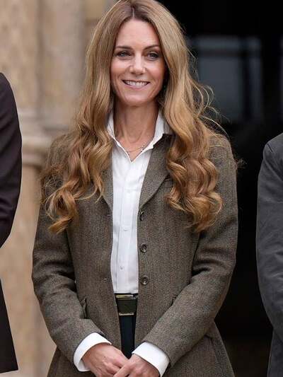Το ντύσιμό της ήταν κομψό καθώς επέλεξε ένα καφέ σακάκι φορεμένο πάνω από ένα λευκό πουκάμισο, το οποίο συνδύασε με μαύρο παντελόνι και καφέ μπαλαρίνες. Για να ολοκληρώσει την εμφάνισή της, φόρεσε ένα κολιέ με τα αρχικά των τριών παιδιών της: του πρίγκιπα Τζορτζ, της πριγκίπισσας Σάρλοτ και του πρίγκιπα Λούις.