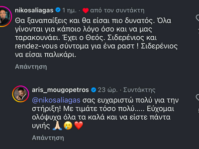 Τέλος, ο Άρης Μουγκοπέτρος ευχαρίστησε τον δημοσιογράφο για τη στήριξη, γράφοντάς του: «Σας ευχαριστώ πολύ για την στήριξη! Με τιμάτε τόσο πολύ… Εύχομαι ολόψυχα όλα τα καλά και να είστε πάντα υγιής».