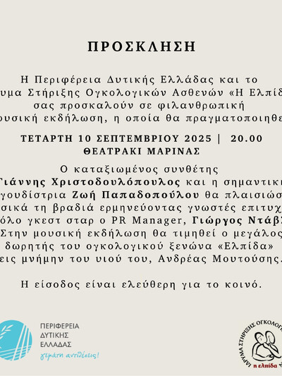 Η Περιφέρεια Δυτικής Ελλάδας και το Ίδρυμα Στήριξης Ογκολογικών Ασθενών «η Ελπίδα» διοργανώνουν φιλανθρωπική μουσική εκδήλωση, η οποία θα πραγματοποιηθεί την Τετάρτη 10 Σεπτεμβρίου 2025, στο θεατράκι της Μαρίνας, στις 20:00.