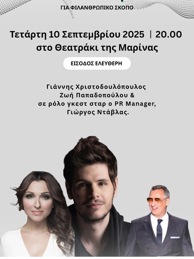 Στο θεατράκι της Μαρίνας, την Τετάρτη 10-9-2025 στις 20.00 με ελεύθερη είσοδο για το κοινό