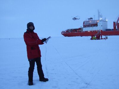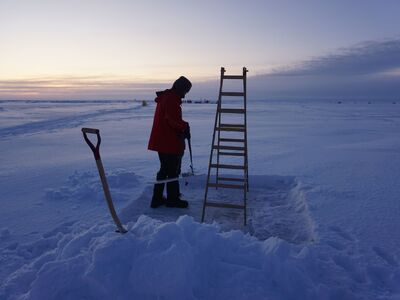 Στους μείον 30 βαθμούς, στην Αρκτική, σε ένα απέραντο και απόκοσμο λευκό τοπίο, ο καθηγητής, Δρ. Μιχάλης Τσαμαδός τοποθετεί τα ειδικά όργανα μέτρησης, τα αλτίμετρα, στον θαλάσσιο πάγο, για να μετρήσει το πάχος του.