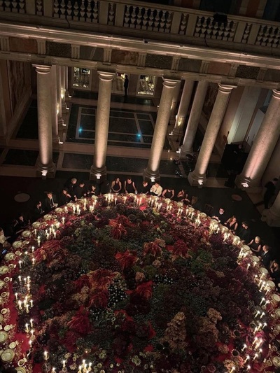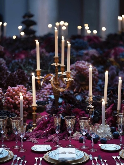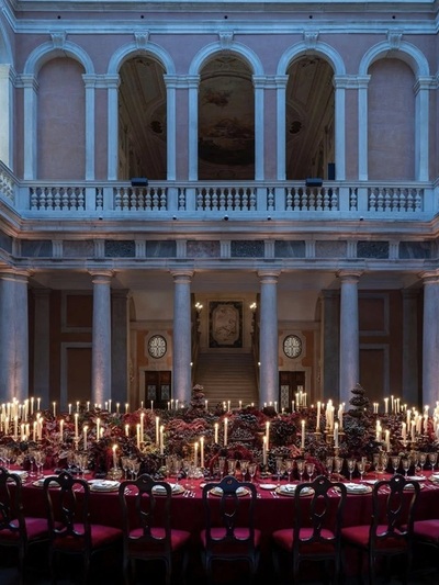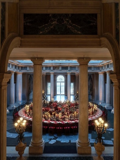Η τραπεζαρία ήταν μια πελώρια ροτόντα, φωτισμένη εσωτερικά. Διακοσμήθηκε με κεριά και σερβίτσια σε χρυσό, πάνω σε βαθυκόκκινο τραπεζομάντηλο. Στο κέντρο του τραπεζιού τοποθετήθηκε μια σύνθεση, σαν «χαλί» από λουλούδια, φυτά και φρούτα. Όλα τα στοιχεία φάνταζαν σαν να φύτρωσαν εκεί πάνω.