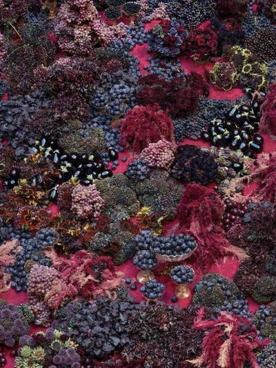 Πελώρια η ροτόντα στο Palazzo Grassi σε βαθυκόκκινο, magenda, χρυσό, με μαύρα σταφύλια… μέχρι και μελιτζάνες!