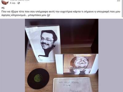 «Που να ήξερα τότε που σου υπέγραφα αυτή την ευχετήρια κάρτα τι σήμαινε η υπογραφή που μου άφησες κληρονομιά… μπαμπάκα μου» έγραψε χαρακτηριστικά, εκφράζοντας με λόγια την ανείπωτη απουσία αλλά και την αιώνια παρουσία του πατέρα της στη ζωή της.