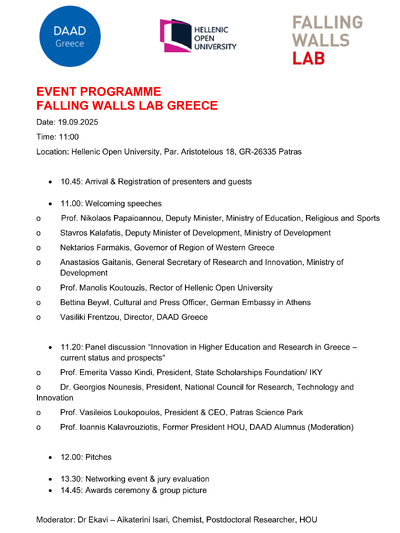 Ο μοναδικός διαγωνισμός καινοτομίας Falling Walls Lab Greece θα λάβει χώρα στις 19 Σεπτεμβρίου 2025 στο Ελληνικό Ανοικτό Πανεπιστήμιο στην Πάτρα.