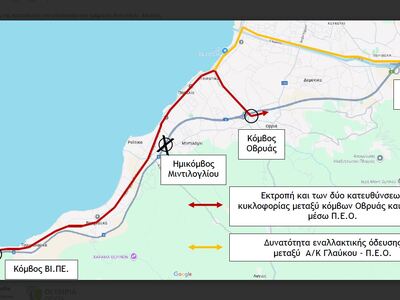 Η Ολυμπία Οδός ενημερώνει τους οδηγούς ότι, στο πλαίσιο των εργασιών για την ολοκλήρωση του υπολειπόμενου τμήματος Μιντιλόγλι- Αλισσός του νέου αυτοκινητόδρομου Πατρών- Πύργου, από τη Δευτέρα 15/9/2025 ώρα 14:00 έως την Κυριακή 30/11/2025 θα τεθεί σε εφαρμογή προσωρινή εκτροπή της κυκλοφορίας και των δύο κατευθύνσεων μεταξύ του Ανισόπεδου Κόμβου (Α/Κ) Οβρυάς και του Α/Κ ΒΙ.ΠΕ προς την Π.Ε.Ο. Πατρών-Πύργου.