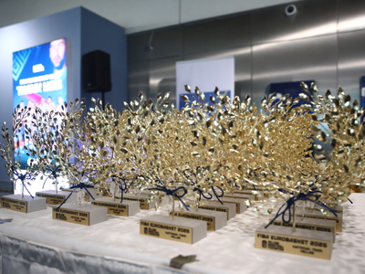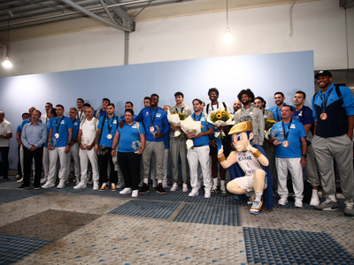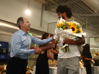 Οι διεθνείς εμφανίστηκαν όλοι με τα μετάλλιά τους στο στήθος, ενώ τους απονεμήθηκαν ανθοδέσμες και τιμητικές πλακέτες για τη μεγάλη αυτή επιτυχία, που έγραψε μια νέα σελίδα στην ιστορία του ελληνικού μπάσκετ.