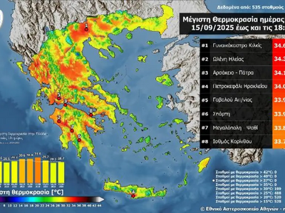 Υψηλές κατά τόπους θερμοκρασίες σημειώθηκαν στη χώρα τη Δευτέρα 15/09, με τις μέγιστες θερμοκρασίες να φτάνουν κατά τόπους στους 33-34°C.