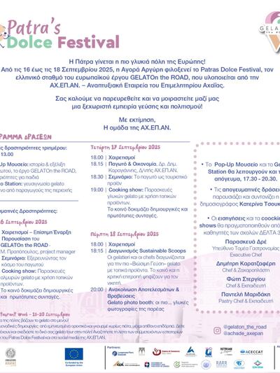 Παράλληλα, από τις 15 έως τις 20 Σεπτεμβρίου η PatrasGelatoRestaurantWeek θα απλώσει τη γιορτή σε όλη την πόλη, με εστιατόρια που εμπνέονται από το gelato και δημιουργούν ξεχωριστά μενού.