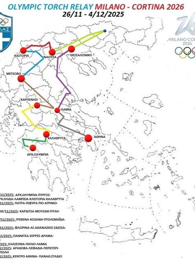 Αναλυτικά, η Φλόγα θα ξεκινήσει από την Αρχαία Ολυμπία και θα διανύσει σταδιακά διαδρομές μέσα από πόλεις και περιοχές όπως: Πύργος, Αμαλιάδα, Κλειτορία, Καλάβρυτα, Πάτρα, Αγρίνιο, Καρπενήσι, Μέτσοβο, Κοζάνη, Καστοριά, Φλώρινα, Νάουσα, Σέρρες, Δράμα, Θεσσαλονίκη, Λαμία, Αράχωβα, Λιβαδειά, Αθήνα, καταλήγοντας στο Παναθηναϊκό Στάδιο στις 4 Δεκεμβρίου 2025 για την Τελετή Παράδοσης στην Οργανωτική Επιτροπή «Μιλάνο-Κορτίνα 2026», ώστε να ξεκινήσει το ταξίδι της στην Ιταλία μέχρι την Τελετή Έναρξης των Χειμερινών Ολυμπιακών Αγώνων που θα πραγματοποιηθεί στις 6 Φεβρουαρίου 2026.