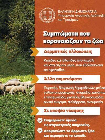 Όπως αναφέρει, η ευλογιά των αιγοπροβάτων είναι μια σοβαρή νόσος που προσβάλλει μόνο τις αίγες και τα πρόβατα, με τα κύρια συμπτώματα που εμφανίζουν τα ζώα να είναι πυρετός, δερματικές αλλοιώσεις κυρίως στα άτριχα μέρη του σώματος, ανορεξία και κατάπτωση.