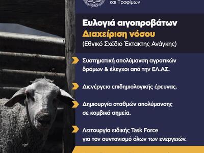 Τα μέτρα που έχουν ληφθεί για τον περιορισμό και εκρίζωση της ευλογιάς των προβάτων όπως επίσης και μια σειρά από οδηγίες προς τους κτηνοτρόφους εφόσον υποψιαστούν ότι κάποιο ζώο έχει μολυνθεί από ευλογιά, έδωσε στη δημοσιότητα το απόγευμα της Τρίτης το υπουργείο Αγροτικής Ανάπτυξης.