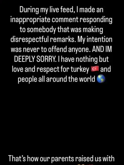 Ο Γιάννης Αντετοκούνμπο ανέβασε και ένα story στο οποίο αναφέρει πως δεν ήθελε να προσβάλει κανέναν όταν έλεγε -κατά τη διάρκεια live του στο Istagram «πάρτε τις τουρκικές σημαίες από εδώ»- και πως απάντησε σε συγκεκριμένο άτομο που έκανε ασεβή σχόλια. Ακόμη τόνισε πως έχει βαθύτατο σεβασμό για την Τουρκία.