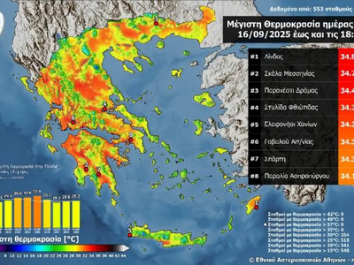 Υψηλές κατά τόπους θερμοκρασίες σημειώθηκαν στη χώρα την Τρίτη 16/09, με τις μέγιστες θερμοκρασίες να ξεπερνούν κατά τόπους στους 33-34°C. Σύμφωνα με το δίκτυο αυτόματων μετεωρολογικών σταθμών του Εθνικού Αστεροσκοπείου Αθηνών / meteo.gr, η υψηλότερη μέγιστη θερμοκρασία καταγράφηκε στη Λίνδο με 34.8 °C. Στον χάρτη της εικόνας που ακολουθεί παρουσιάζεται η κατανομή της μέγιστης θερμοκρασίας στη χώρα καθώς και οι 8 σταθμοί με τις υψηλότερες μέγιστες.