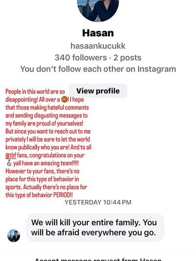 Όπως έγραψε σε story της, «οι άνθρωποι σε αυτόν τον κόσμο απογοητεύουν! Όλο αυτό για το μπάσκετ. Ελπίζω όσοι κάνουν σχόλια μίσους και στέλνουν αηδιαστικά μηνύματα στην οικογένειά μου να είναι περήφανοι για τον εαυτό τους! Αλλά επειδή θέλετε να επικοινωνήσετε μαζί μου ιδιωτικά, θα φροντίσω να ενημερώσω τον κόσμο δημόσια για το ποιοι είστε! Και σε όλους τους οπαδούς της Τουρκίας, συγχαρητήρια για το ασημένιο μετάλλιο σας, έχετε μια καταπληκτική ομάδα!!!! Ωστόσο, δεν υπάρχει χώρος για τέτοιου είδους συμπεριφορές στον αθλητισμό. Στην πραγματικότητα, δεν υπάρχει χώρος για τέτοιου είδους συμπεριφορές, ΤΕΛΟΣ!!».