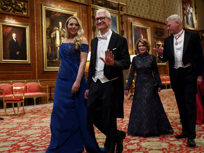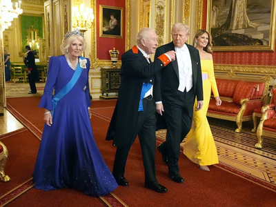 Στο Κάστρο του Ουίνδσορ, το βράδυ της Τετάρτης, παρουσία περίπου 150 προσκεκλημένων, μεταξύ των οποίων ο πρίγκιπας και η πριγκίπισσα της Ουαλίας, επιχειρηματίες όπως ο Τιμ Κουκ και ο Ρούπερτ Μέρντοχ, καθώς και ανώτατοι αξιωματούχοι από το Ηνωμένο Βασίλειο και τις ΗΠΑ, το βασιλικό ζεύγος της Βρετανίας υποδέχθηκε την απαστράπτουσα, μέσα στο κίτρινο, «off shoulder» φόρεμά της, και μία λιλά ζώνη στη μέση, Μελάνια, και τον Ντόναλντ Τραμπ.
