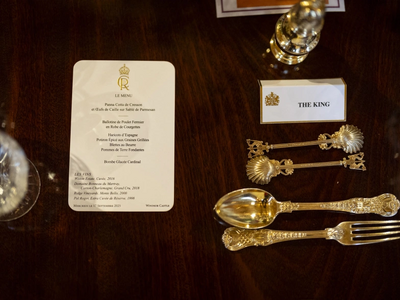 Το μενού ήταν γραμμένο στα γαλλικά, σύμφωνα με την παράδοση των βασιλικών δείπνων, και συνοδευόταν από επιλεγμένα βρετανικά κρασιά. Μεταξύ άλλων, σερβιρίστηκε και ένα vintage κρασί πόρτο του 1945, αφιερωμένο στον 45ο πρόεδρο των ΗΠΑ.
