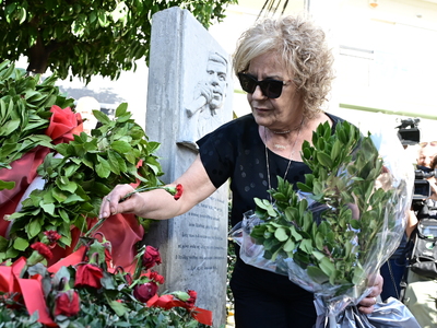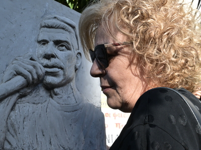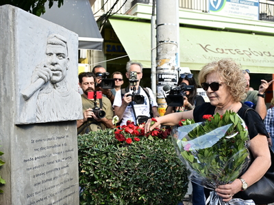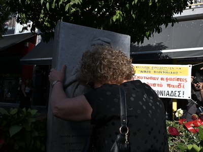 Συγκινημένη η μητέρα του Παύλου Φύσσα αγκάλιασε το μνημείο που έχει στηθεί στο Κερατσίνι για τον γιο της που δολοφονήθηκε από τον χρυσαυγίτη Ρουπακιά.