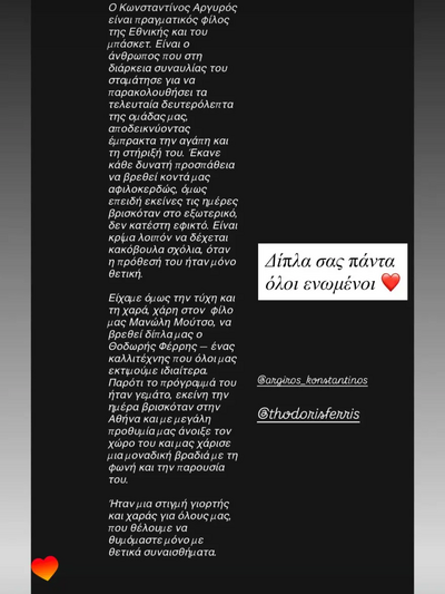 «Ο Κωνσταντίνος Αργυρός είναι πραγματικός φίλος της Εθνικής και του μπάσκετ. Είναι ο άνθρωπος που στη διάρκεια της συναυλίας του σταμάτησε για να παρακολουθήσει τα τελευταία δευτερόλεπτα της ομάδας μας αποδεικνύοντας έμπρακτα την αγάπη και τη στήριξή του. Έκανε κάθε δυνατή προσπάθεια να βρεθεί κοντά μας αφιλοκερδώς, όμως επειδή εκείνες της ημέρες βρισκόταν στο εξωτερικό, δεν κατέστη εφικτό. Είναι κρίμα λοιπόν να δέχεται κακόβουλα σχόλια όταν η πρόθεσή του ήταν μόνο θετική.