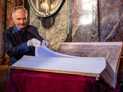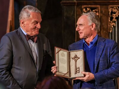Αργότερα σε συνάντηση με εκπροσώπους των μέσων ενημέρωσης φωτογραφήθηκε υπό τους ήχους μουσικής εκκλησιαστικού οργάνου με φόντο ένα αντίγραφο της Βίβλου του Διαβόλου (Codex Gigas), του μεγαλύτερου χειρόγραφου στον κόσμο και παρέλαβε συμβολικά το Κλειδί της Πόλης από τον δήμαρχο της Πράγας, Μπόχουσλαβ Σβόμποντα.